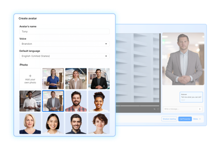 Chat-avatar presents content through visuals, fosters interactive experiences, and tracks real-time performance while tailoring conversations based on your configurations and knowledge base.