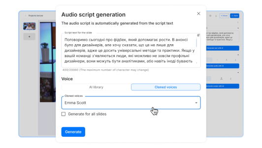 - Voice cloning for realistic delivery: