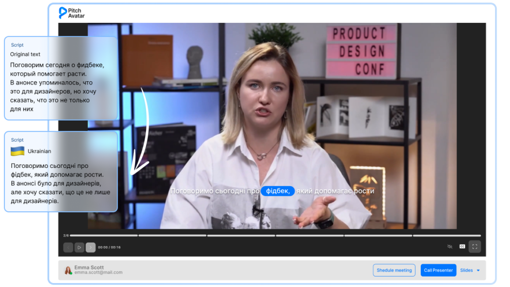 “In 2022, we made the decision to discontinue content in Russian completely. Since the platform has been active since 2017, we have accumulated many lectures that need to be re-recorded. However, this posed several challenges – many content creators could not produce high-quality re-recordings, and the process would have required extensive team resources, including managers, video production specialists, designers, and copywriters. Partnering with Pitch Avatar allowed us to overcome these challenges quickly and without utilizing our internal team’s resources. We are extremely pleased with the result and look forward to continuing our collaboration“
