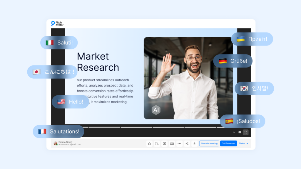Upload product presentations once, and Pitch Avatar delivers them in multiple languages with localized voiceovers, saving 50% on translation and media production costs.