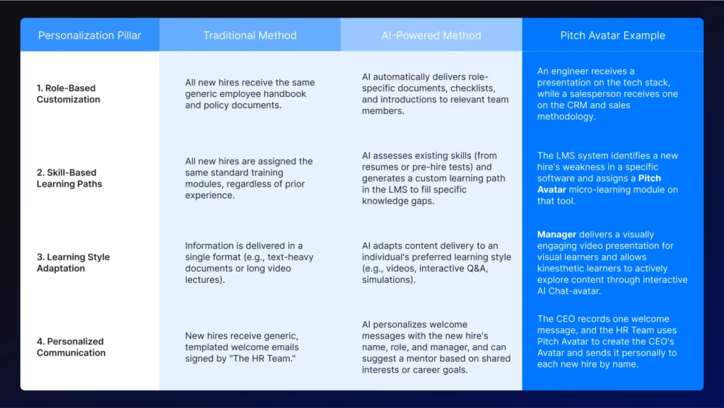 By contrast, the AI-driven onboarding process for a new marketing manager might include branding modules, access to the company’s social media management tools, and introductions to the content and design teams.