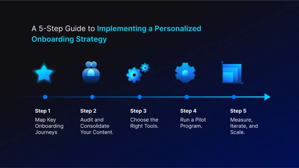 Transitioning to an AI-powered, personalized onboarding strategy is a process that requires a systematic approach. This five-step roadmap serves as a practical guide for HR managers and senior executives, helping them move from concept to execution. This guide will help you create an action plan, organize content, select the right technologies, and build a cycle of continuous improvement.